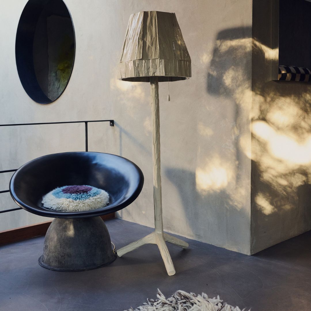 Podna lampa Teun Zwets polazi od svima prepoznatljive siluete, forme koja se na prvi pogled čita kao “lampa”. No upravo tu počinje njezina transformacija. Kroz materijal, završnu obradu i pažljivo naglašene detalje, klasičan oblik namjerno je pomaknut i distorziran. Kombinacija sirove teksture i debelog, sjajnog premaza mijenja očekivanja o tome kako bi tradicionalna podna lampa trebala izgledati.