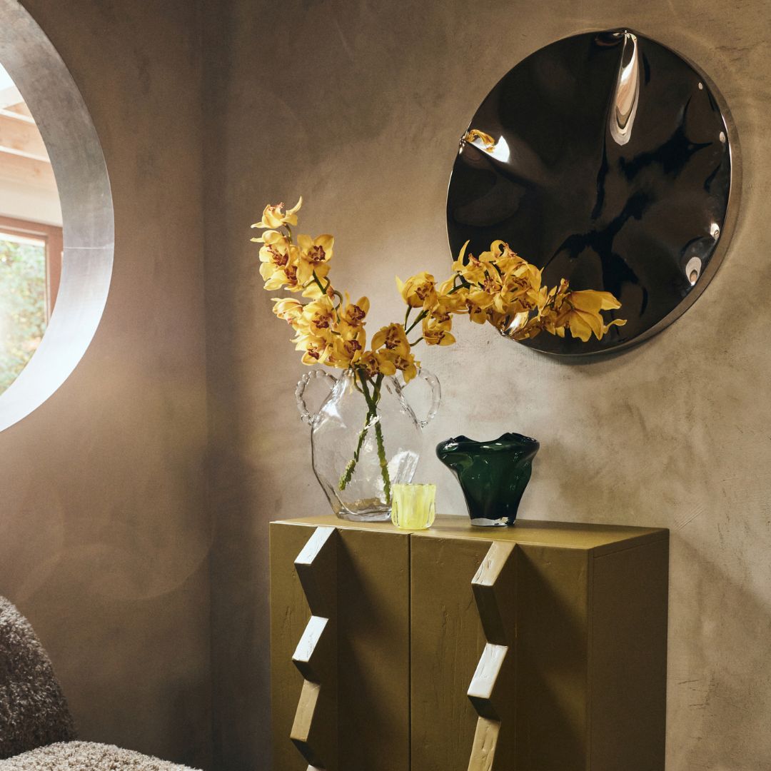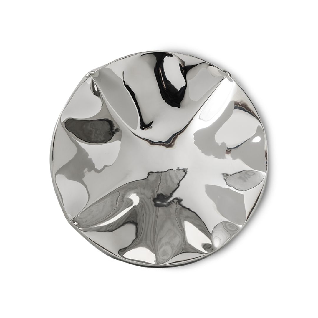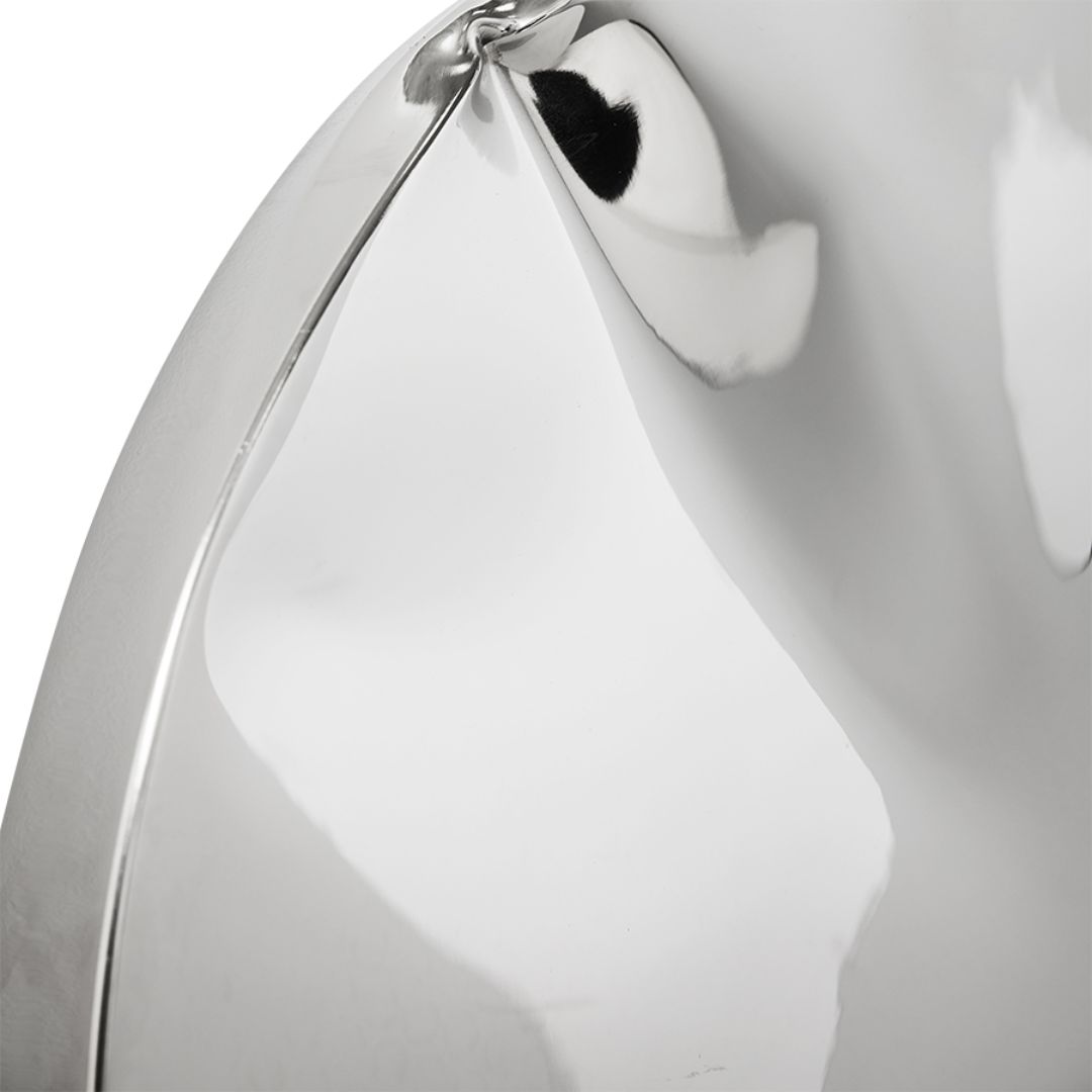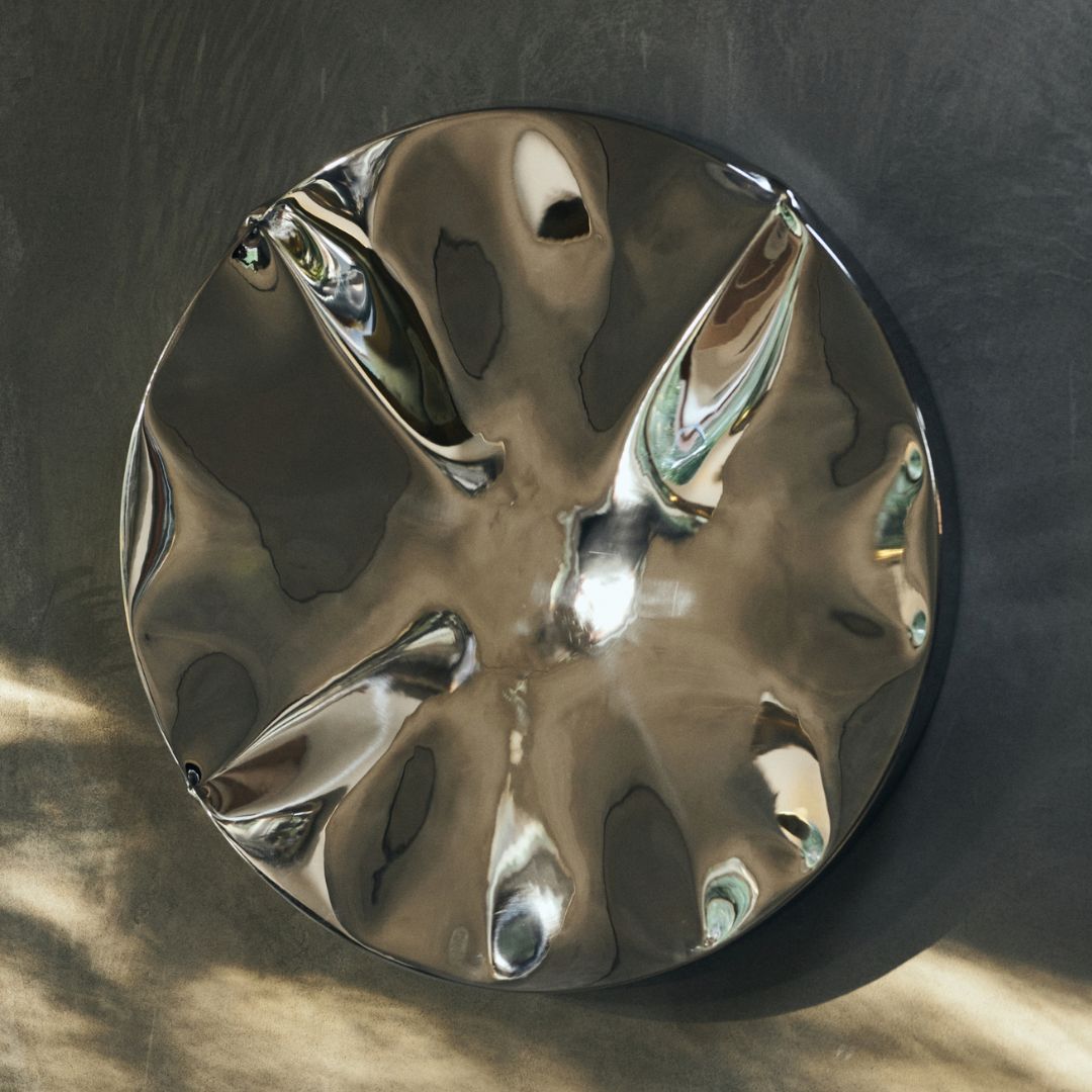 Zidna skulptura Dent ima kromiranu površinu koja je udubljena i remeti ono što odražava. Njezin namjerno udubljeni oblik razbija zrcalnu završnu obradu, pretvarajući odraz u nešto apstraktno i nepredvidivo. Umjesto da pruža jasnoću, stvara vizualnu napetost privlačeći pogled iznova i iznova. Odvažna, skulpturalna izjava koja zid pretvara u iskustvo.